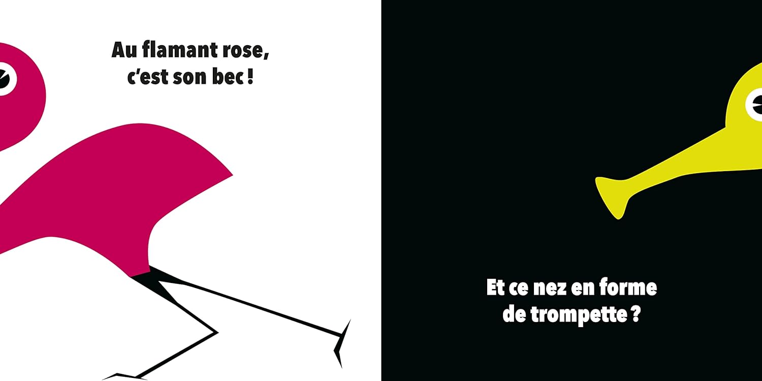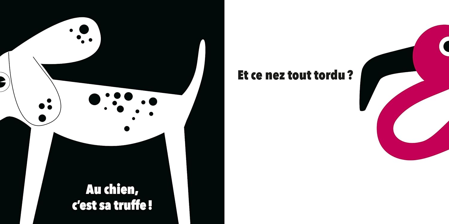 Un album aux couleurs contrastées pour découvrir les animaux (chien, flamant rose, hippocampe, sanglier, crocodile, dauphin, etc.) à partir de leur nez.