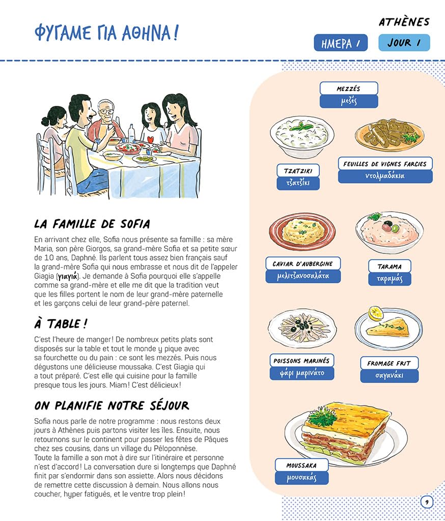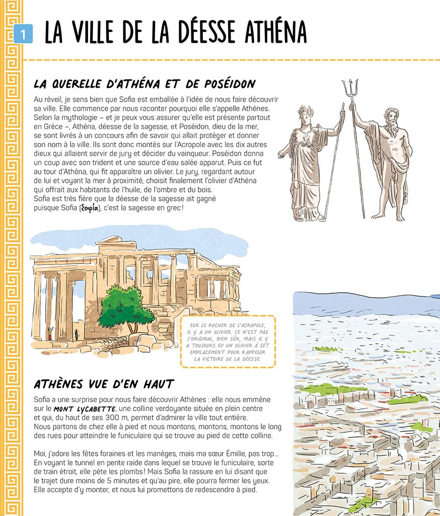 Bienvenue en Grèce ! . Mon voyage au pays de la mythologie . Pars à la découverte de la Grèce en suivant le voyage de Noa et de sa soeur. Guidés par leur amie Sofia, ils parcourent tout le pays, du mont Olympe au Péloponnèse, en passant par les nombreuses îles. Leur périple commence dans les quartiers d’Athènes et les mène ensuite jusqu’aux sites incontournables : Mycènes, Épidaure, Sparte, Olympie, Delphes.