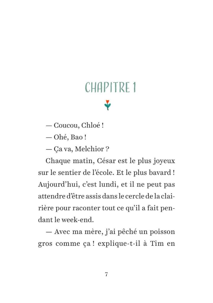 À l’école des bois, il y a un maître et une maîtresse, mais pas de murs, ni de bureaux ou de tableau. Juste la forêt… Et des élèves très curieux ! . César est inquiet. Aujourd’hui, ses camarades et lui doivent fabriquer leurs propres crayons. Ça ne peut vouloir dire qu’une chose : il va falloir écrire… Et César déteste écrire !. + Une activité à réaliser dans la nature .