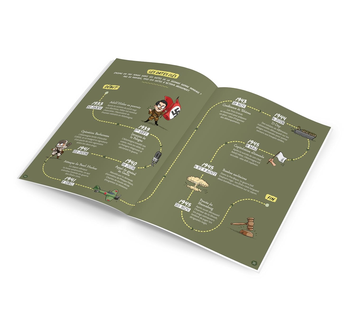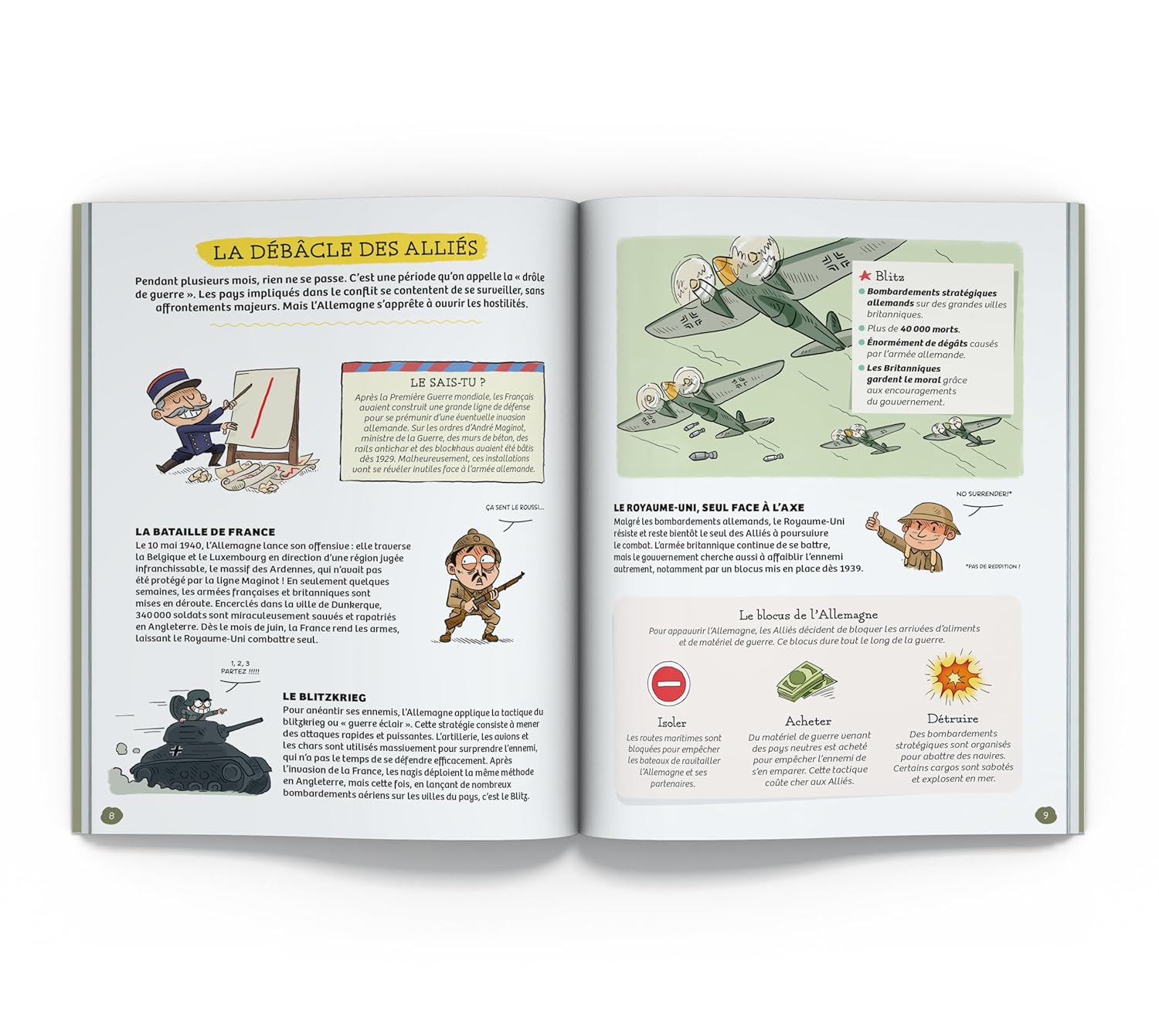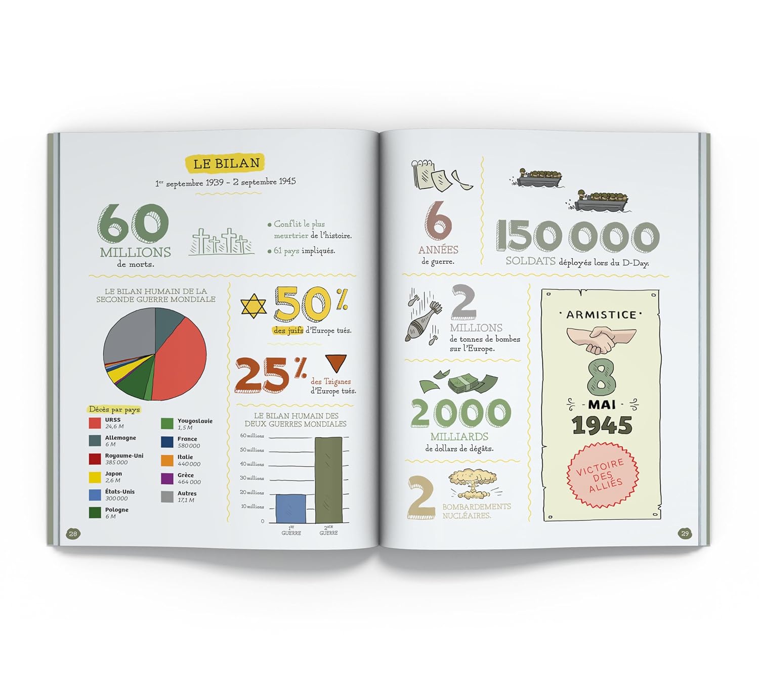 Des combats, oui. Beaucoup de pays concernés, oui. Mais encore ?Plonge dans ce livre illustré et plein d’humour, pour comprendre les éléments clés de la Seconde Guerre mondiale. En plus, il est hyper facile à lire avec ses infographies et ses chiffres-clés !