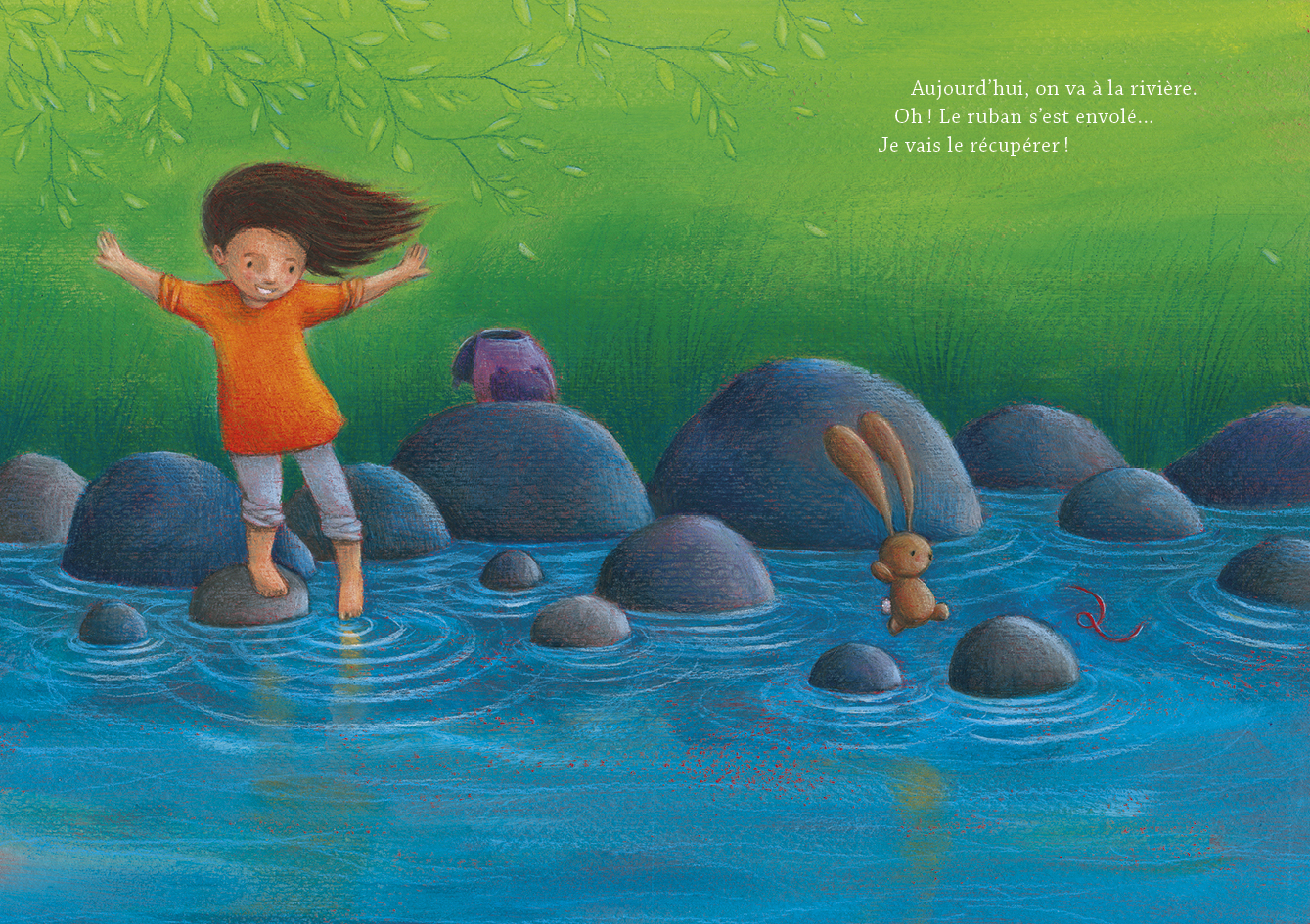 Oups, le ruban s’est envolé ! . Ni une ni deux, Ciao essaye de le rattraper, mais un instant de distraction et le voilà perdu de vue.. Peut-être est-il parmi les têtards dans la forêt d’algues ?. Ou bien pris dans les branches du saule pleureur ?. Que l’exploitation commence !.