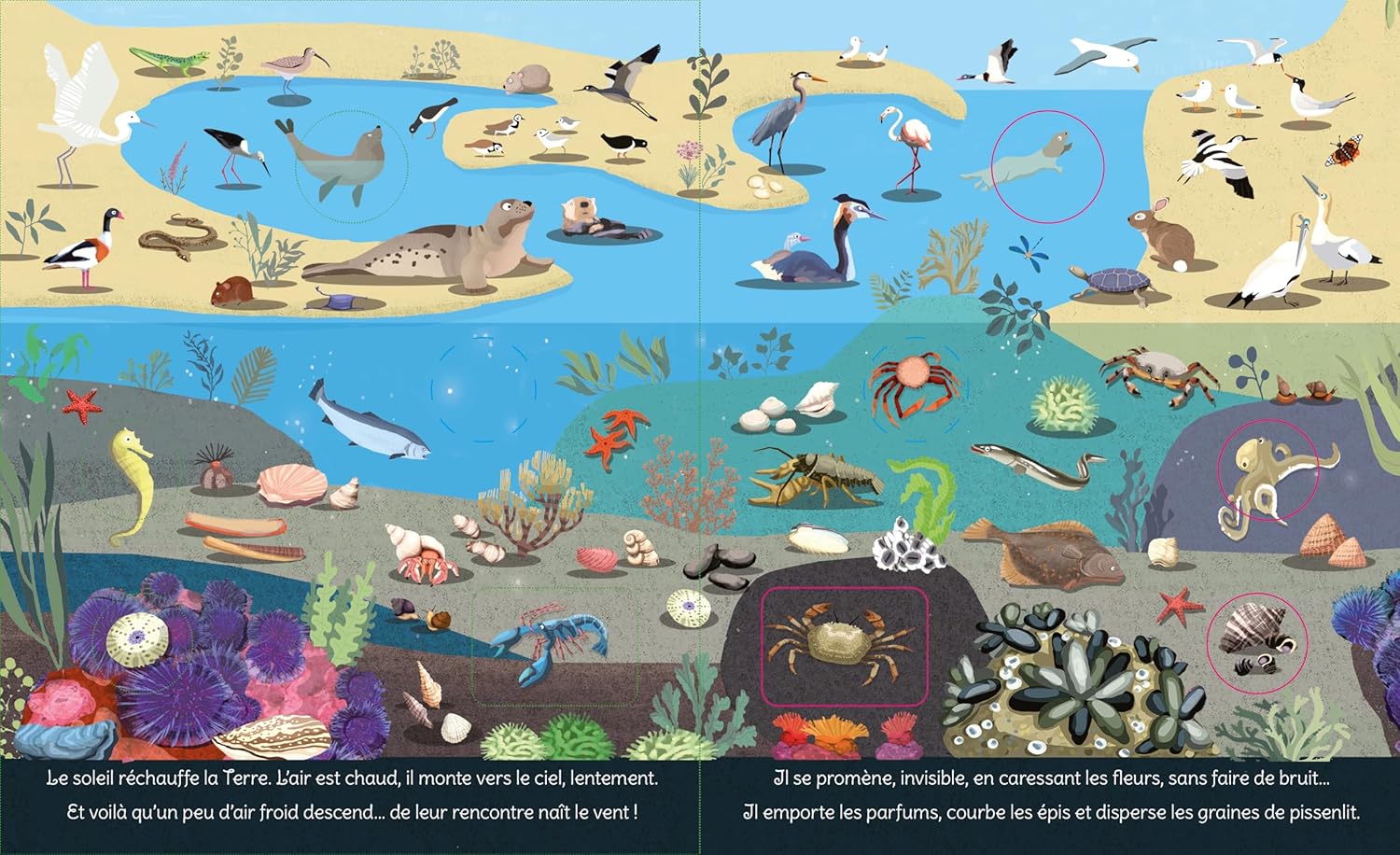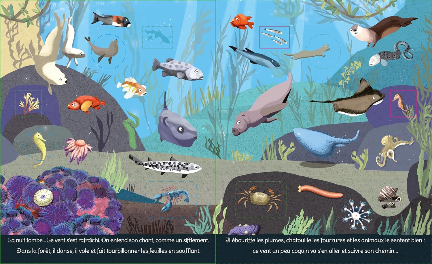Observe les mers et les océans du monde pour découvrir la vie sous-marine. . Ce livre contient différents niveaux de lecture qui permettront à tous les enfants de participer activement à la lecture : soit ils imaginent leur propre histoire en observant tous les détails, en imitant les animaux, en parlant de ce qu’ils connaissent ; soit ils se laissent porter par le texte poétique tout en regardant les magnifiques illustrations.