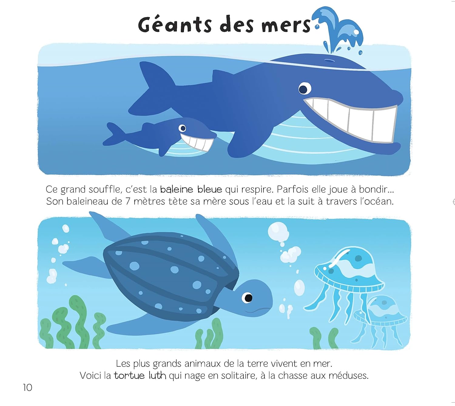 Pour tout savoir sur la mer : le bord de l’eau, les fonds marins, les bateaux, la pêche, les marées ou encore la plage. Avec des jeux et deux planches d’autocollants.