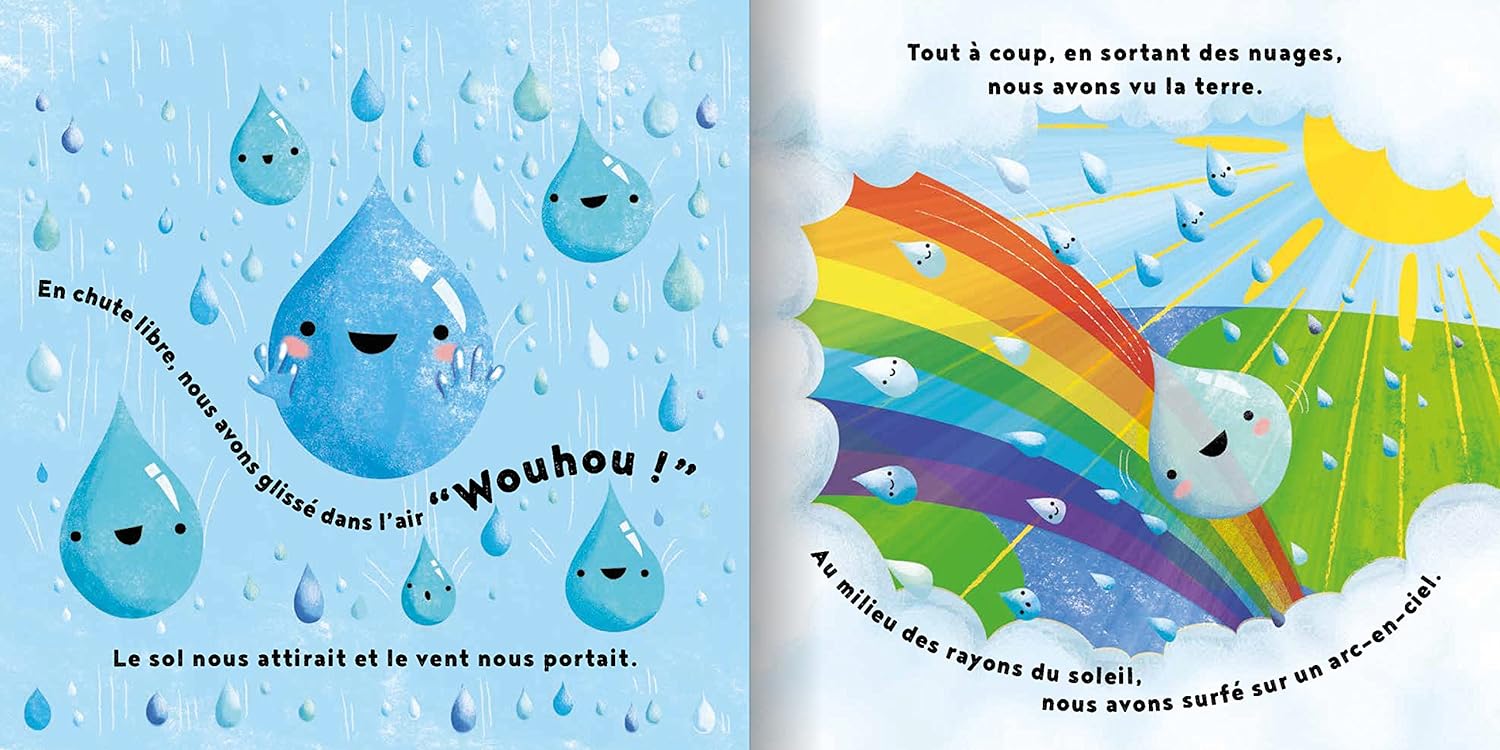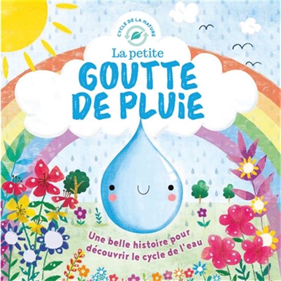 La pluie goutte de pluie vit paisiblement dans un nuage, jusqu’au jour où un orage éclate. Elle tombe du nuage, joue dans un arc-en-ciel, s’infiltre dans la terre et remonte par la tige d’une plante… Sur le cycle de l’eau.