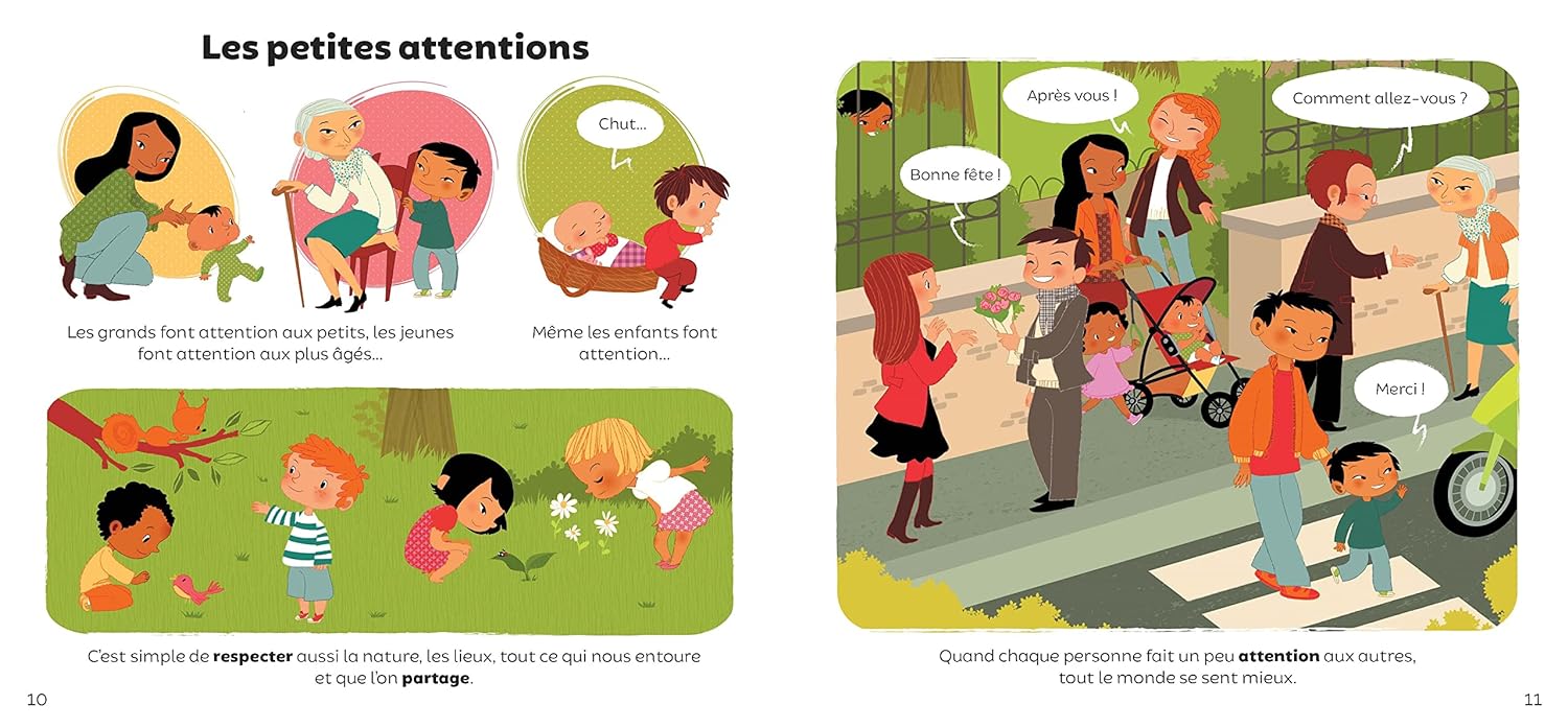 Un documentaire sur la politesse avec, en fin d’ouvrage, une double page de jeux sur les thèmes abordés : les salutations, les remerciements, les demandes, l’acquiescement, les excuses, la discrétion et les gentilles attentions.