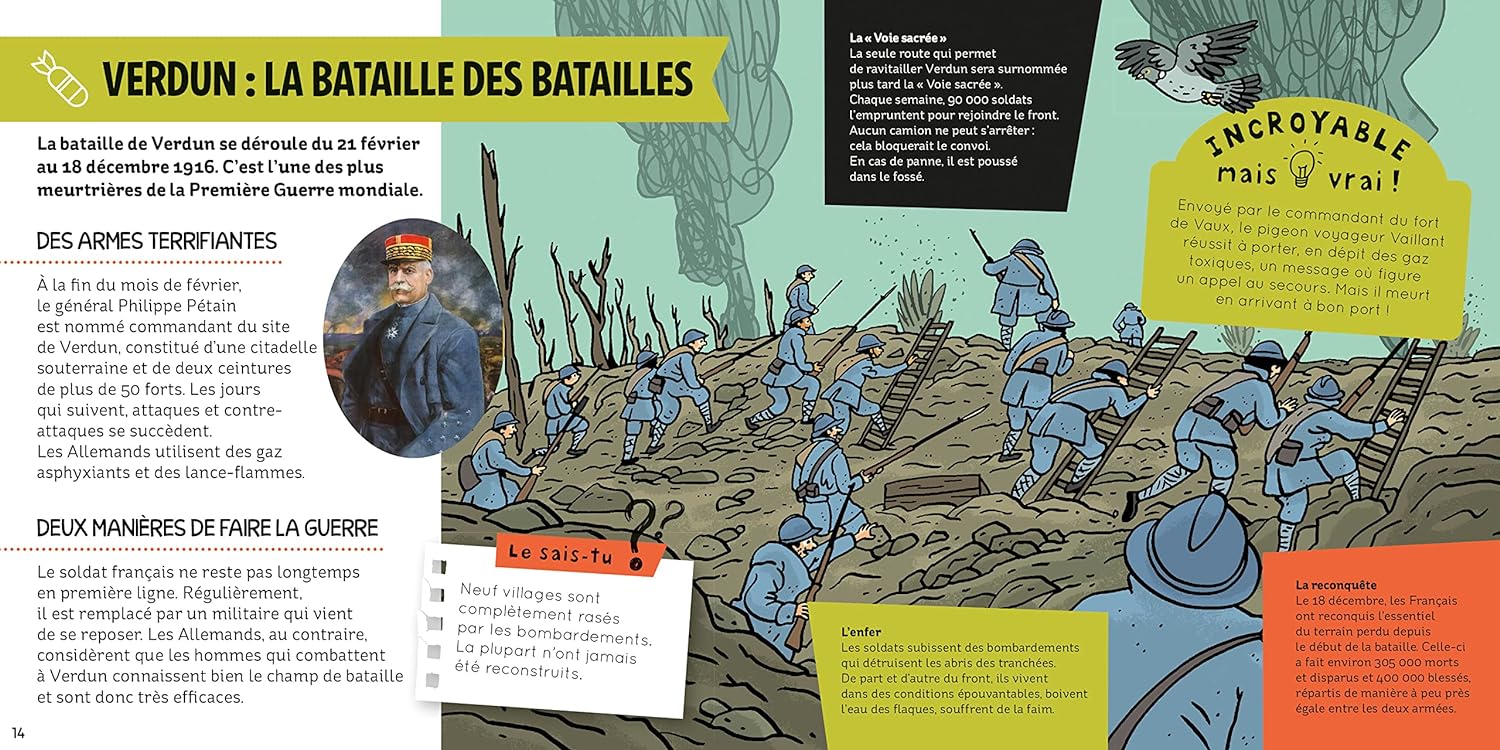 Un documentaire illustré avec des quiz et des activités sur la Première Guerre mondiale : les grandes batailles en France et à l’étranger, le quotidien des soldats, la signature de l’armistice, entre autres. Une frise chronologique permet à l’enfant de se repérer dans le temps.