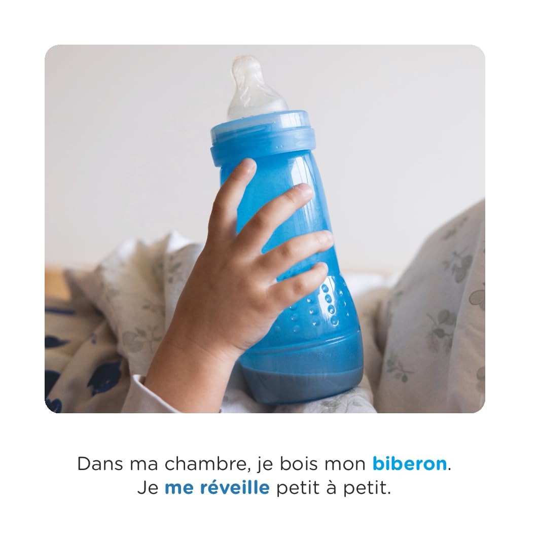 Prépare-toi le matin à partir à l’école, avec Gabin Découvre en vingt-quatre pages, chaque étape : sortir du lit, mettre ses chaussons, prendre le petit déjeuner, s’habiller, faire sa toilette…
