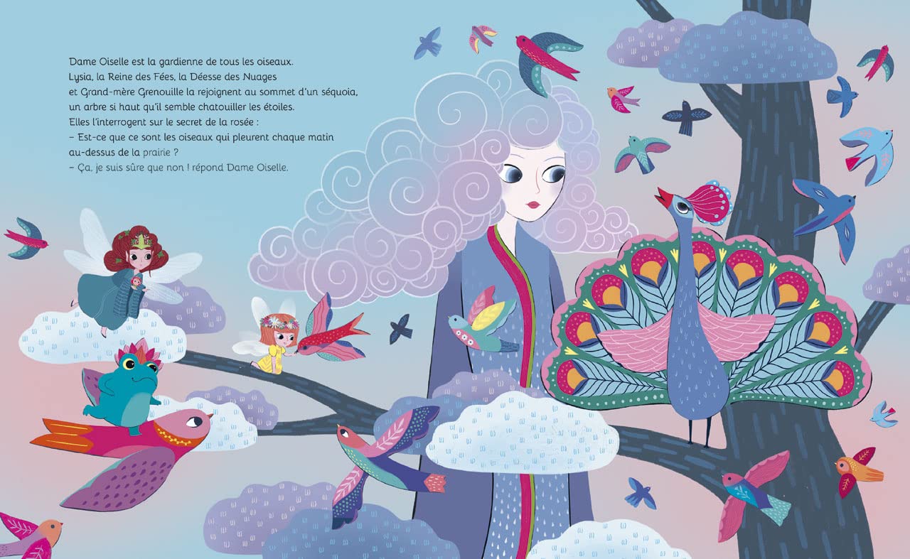 Lysia, une petite fée, se demande d’où vient la rosée. Elle questionne la reine des fées, la déesse des nuages, grand-mère Grenouille et dame Oiselle, en vain. Elle s’installe alors dans une prairie où elle attend que le jour se lève pour découvrir comment la rosée parsème le paysage tous les matins.