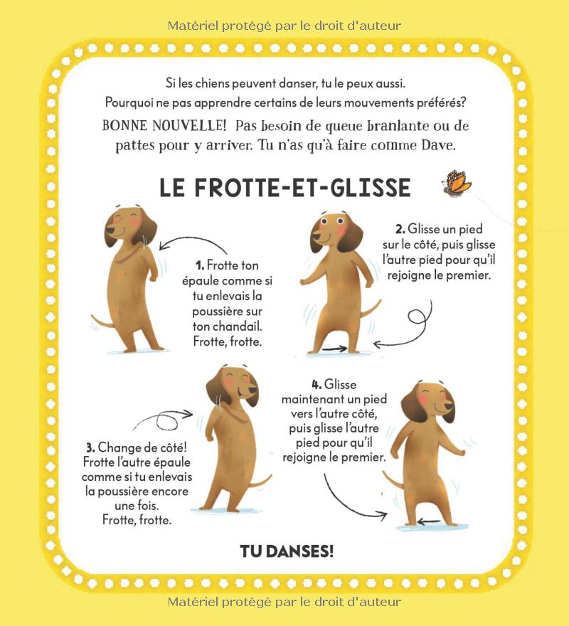 Un album qui souligne l’importance de l’amitié, de la résilience et de la gentillesse. À la fin du livre, les petit-es lecteur-rices peuvent apprendre quelques-uns des pas de danse préférés de Dave!