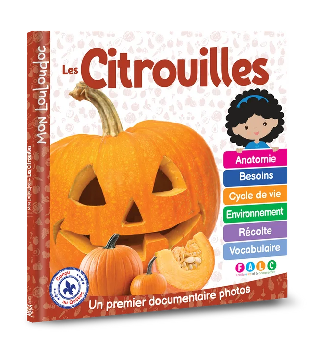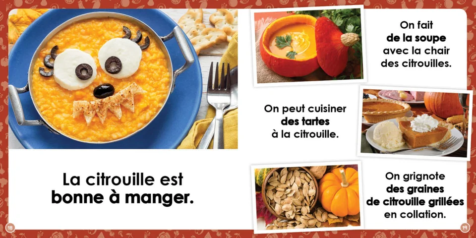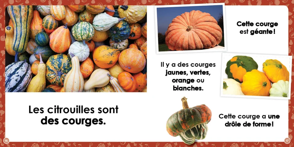 La mise en page épurée, et le glossaire des mots utiles à connaître en fin d’ouvrage, font de Les citrouilles un outil parfait pour inviter les enfants à consommer des courges toute l’année.