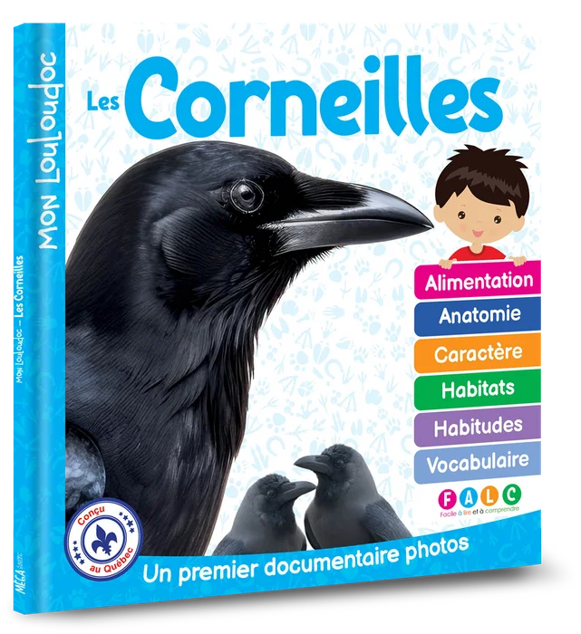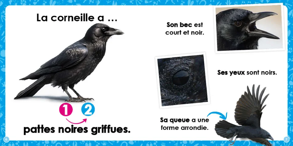 La mise en page épurée, et le glossaire des mots utiles à connaître en fin d’ouvrage, font de Les corneilles un outil parfait se familiariser avec ces oiseaux aussi sociables qu’intelligents.