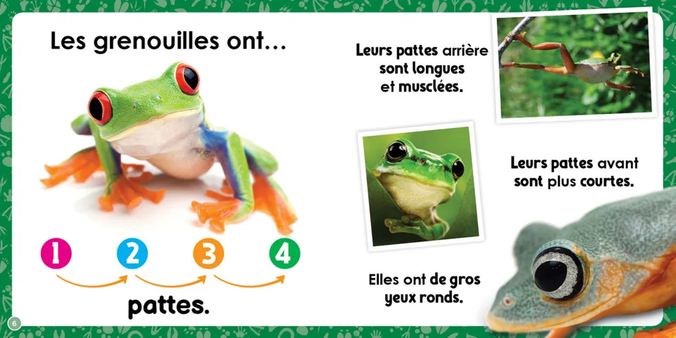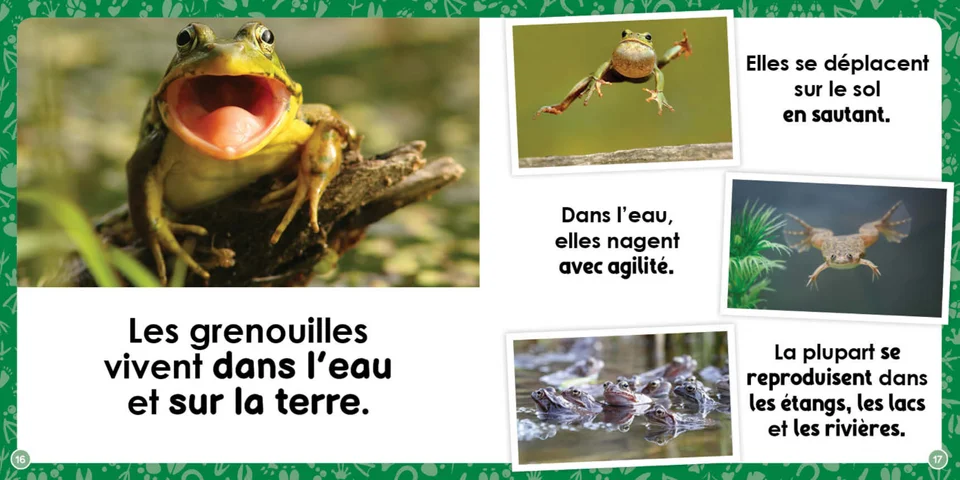 La mise en page épurée, et le glossaire des mots utiles à connaître en fin d’ouvrage, font de Les grenouilles un outil parfait pour initier les enfants à l’univers de ces animaux étonnants ainsi que des caractéristiques qui les distinguent.