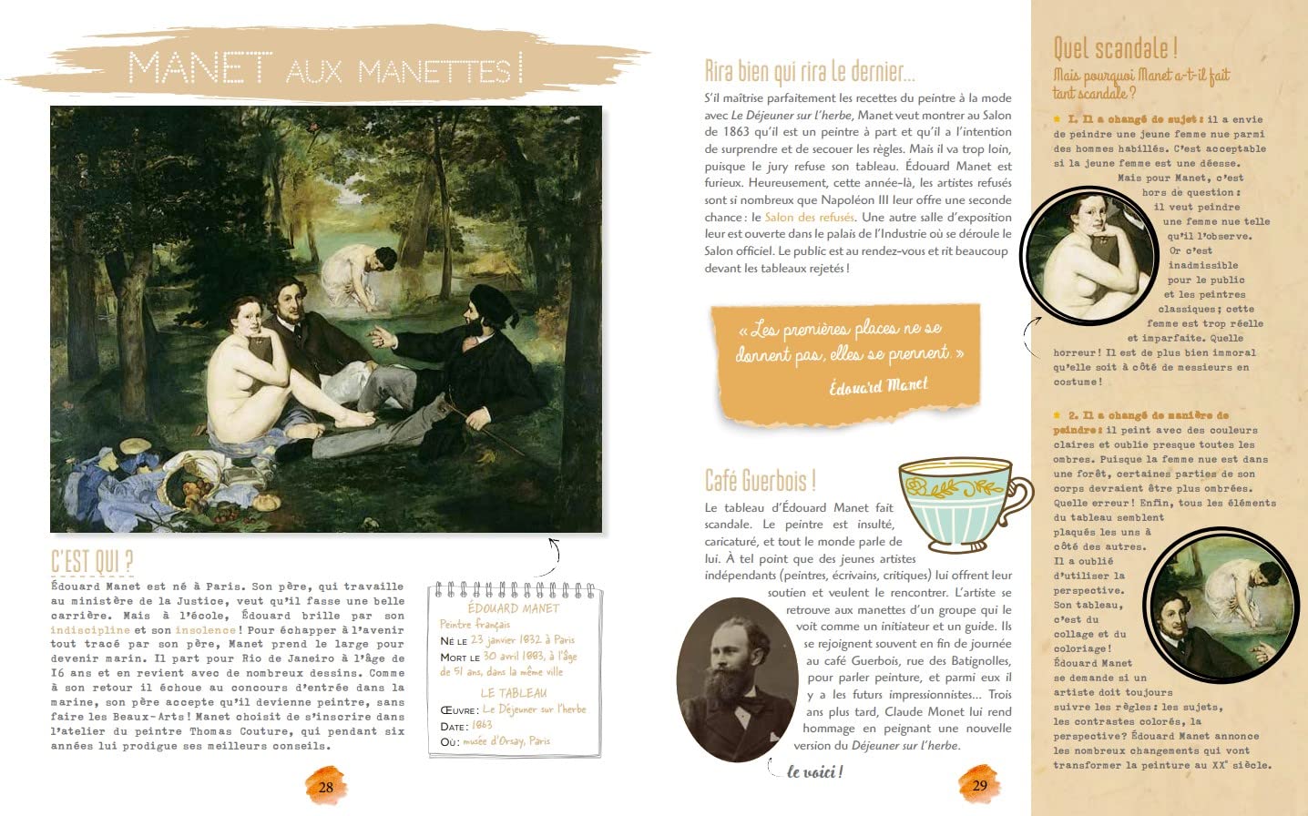 Le livre d’art… pour les enfants ! . C’est quoi l’impressionnisme ? Qui sont les plus grands peintres de ce courant pictural majeur ? Où peut-on voir leurs oeuvres ? Que représentaient-elles ? Quelles couleurs préféraient-ils ? Y avait-il des femmes dans ce mouvement ? Et pourquoi certains tableaux ne semblent-ils pas terminés ?. Autant de questions auxquelles ce livre répond grâce à des explications claires, amusantes et ludiques, des jeux, des quiz et des petits mémos ! Monet, Renoir, Degas et Cézanne n’auront bientôt plus aucun secret pour vous…. Un livre unique et indispensable pour guider les enfants dans leur découverte de l’art et mieux comprendre les grandes oeuvres !.