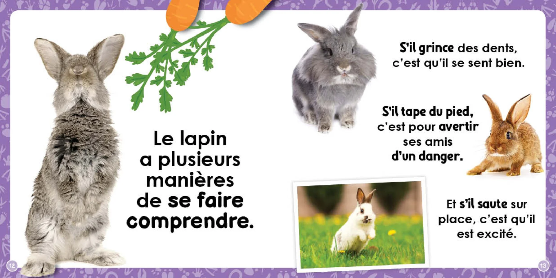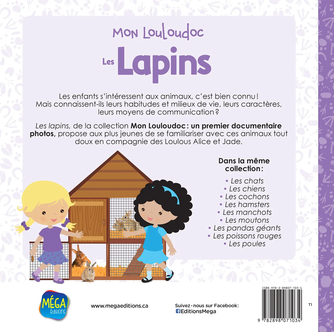 Les Loulous présentent… Les lapins, de la collection Mon Louloudoc : un premier documentaire photos, destinée aux tout-petits.Alice et Jade, deux des quatre Loulous bien connues du public, accompagnent les enfants tout au long de la lecture de ce documentaire facile à lire et à comprendre, illustré avec des photographies ravissantes.La mise en page épurée, et le glossaire des mots utiles à connaître en fin d’ouvrage, font de Les lapins un outil parfait pour initier les enfants à l’univers de ces animaux des quatre coins du monde ainsi que des caractéristiques qui les distinguent.Création 100% québécoise.En bref:Textes de Marie-Claude Ouellet, biologiste et vulgarisatrice scientifique;Encourage le goût de la lecture;Favorise le développement et l’usage du vocabulaire lié au monde des animaux des jardins.