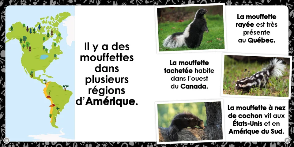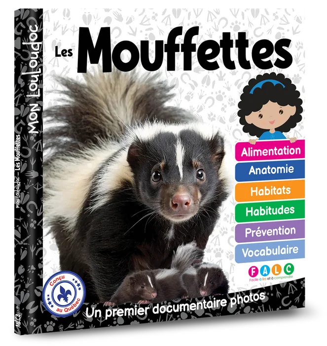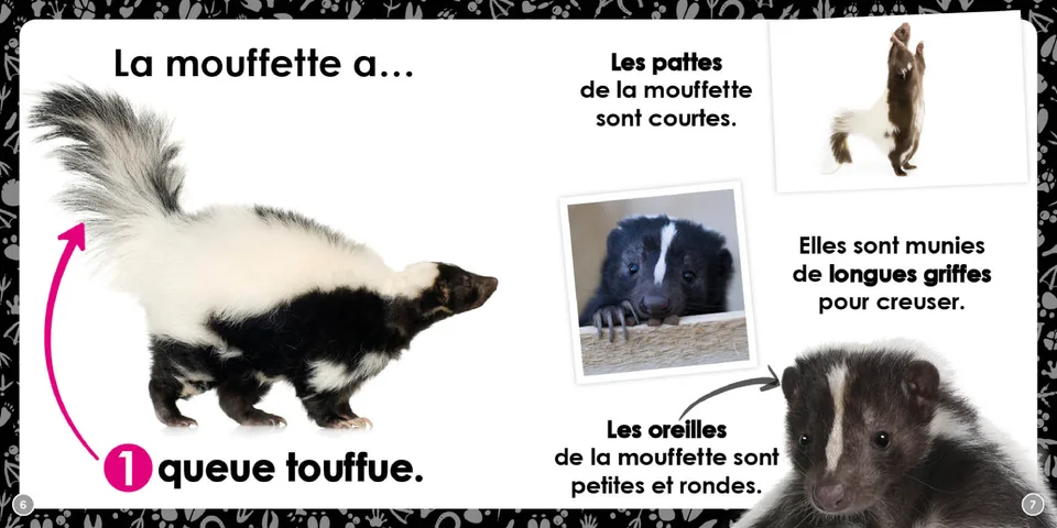 La mise en page épurée, et le glossaire des mots utiles à connaître en fin d’ouvrage, font de Les mouffettes un outil parfait pour apprendre à reconnaître les comportements de défense de ces bêtes puantes et à les éviter.