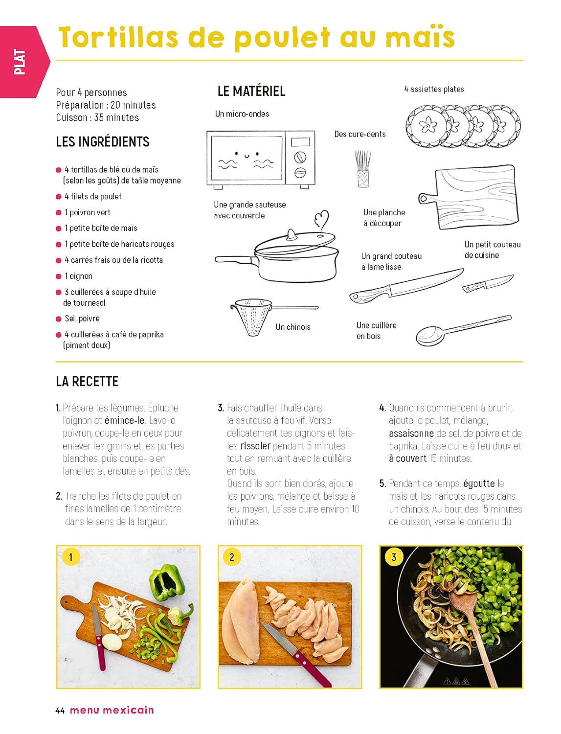Pour chaque menu, 2 ou 3 recettes à réaliser toi-même en suivant les explications. Étape par étape les photos te guideront et t’aideront à bien comprendre chaque geste.