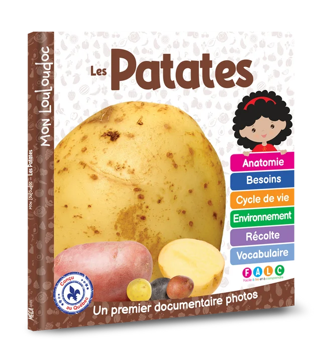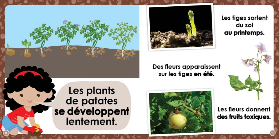 La mise en page épurée, et le glossaire des mots utiles à connaître en fin d’ouvrage, font de Les patates un outil parfait pour initier les enfants au cycle de vie des pommes de terre et les encourager à en cultiver en classe ou à la maison.