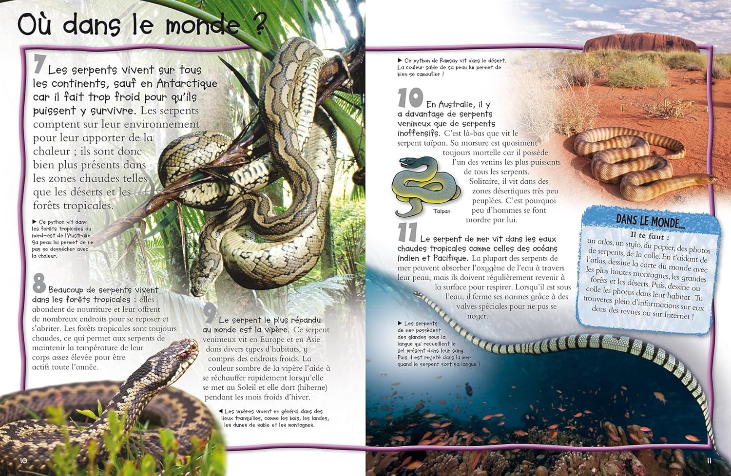 Cent faits numérotés concernant les serpents : les différentes espèces, leur mode de vie, leur technique de chasse, etc. Avec des quiz et des activités.