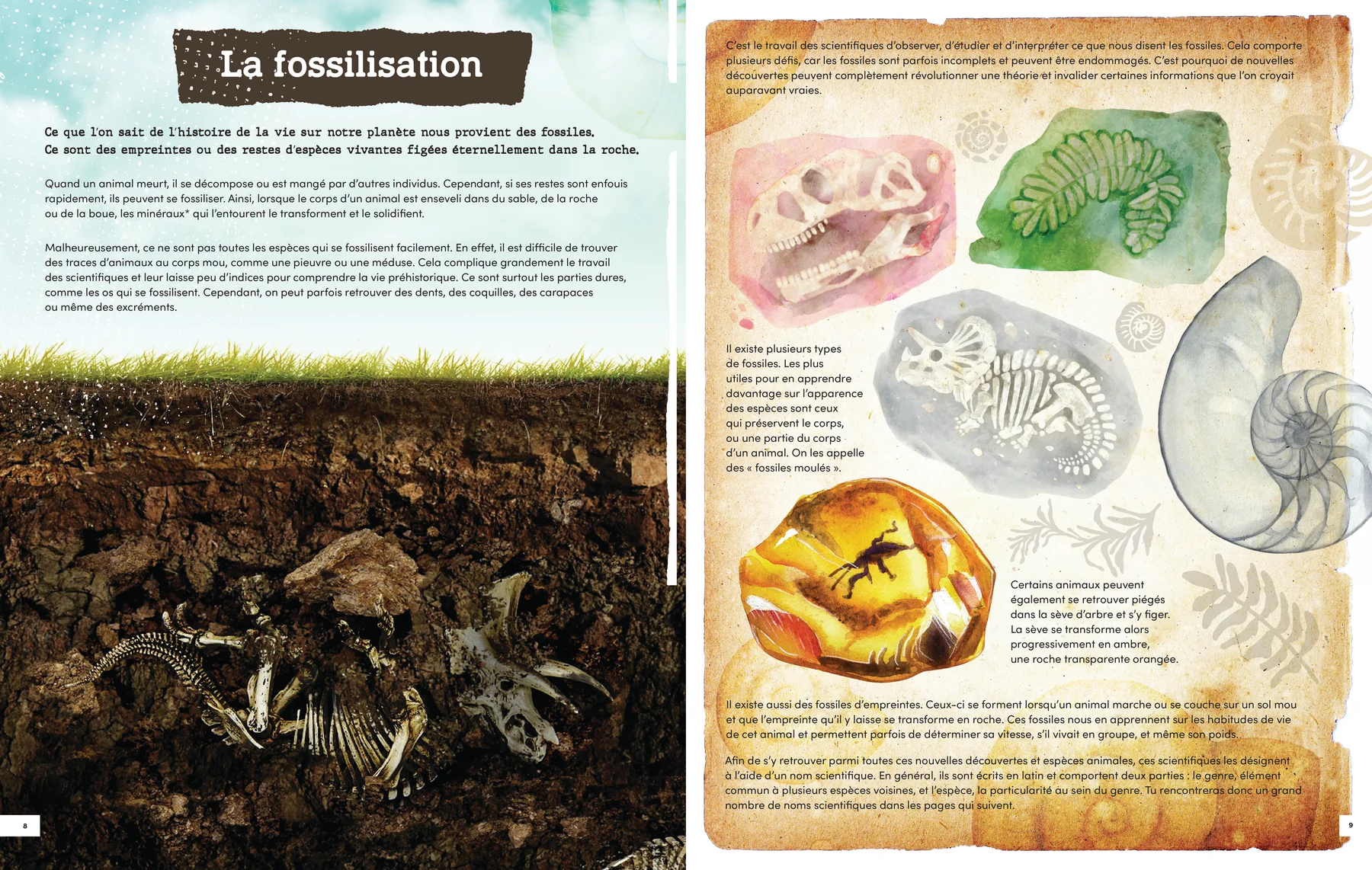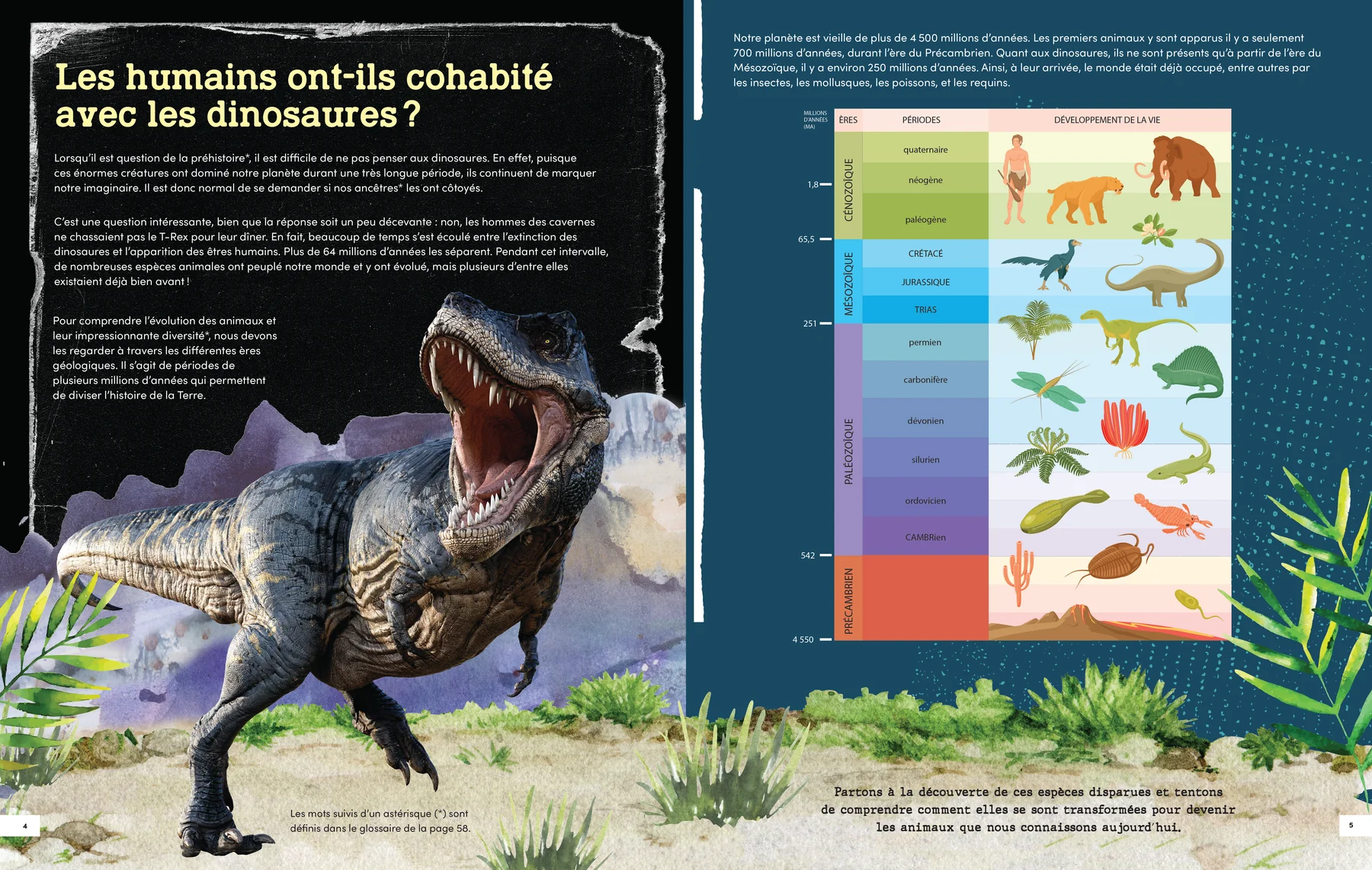 Cet ouvrage passionnant, rempli d’illustrations à couper le souffle, dévoile de nombreuses espèces qui existaient il y a des millions d’années, ainsi que la manière dont elles ont se sont transformées pour devenir les animaux que nous connaissons aujourd’hui. Avec une longue introduction pour bien définir les concepts essentiels à la compréhension de ce livre, chaque double page traite de l’évolution d’un type d’espèce à travers le temps : les insectes, les requins, les dinosaures, les mammouths, les géants australiens..