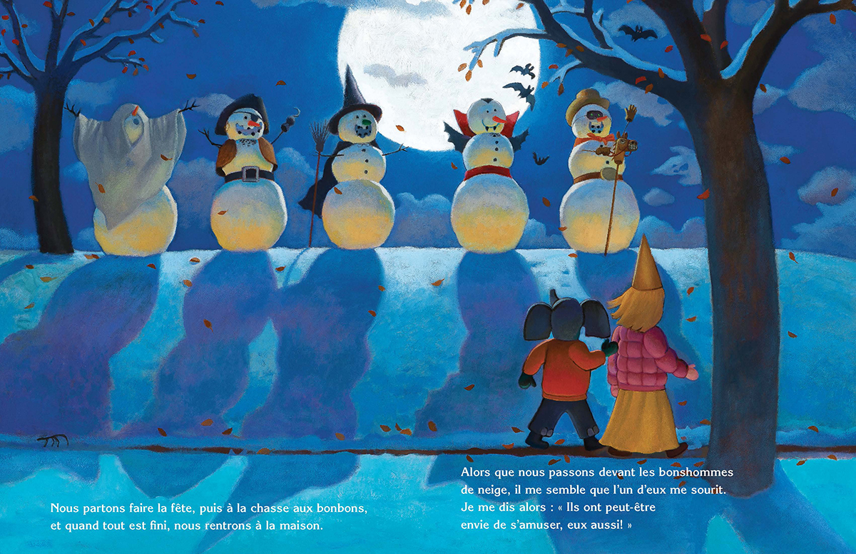Après une première tempête de neige, des enfants font des bonshommes de neige avant de partir à la chasse aux bonbons. Et lorsque les enfants vont dormir, les bonshommes de neige organisent leur propre fête d’Halloween! Il y a des bonbons, des concours de déguisements et toutes sortes d’activités automnales. Lorsque les enfants se réveillent, le lendemain matin, les bonshommes de neige ont disparu… mais en laissant derrière eux un message très spécial.