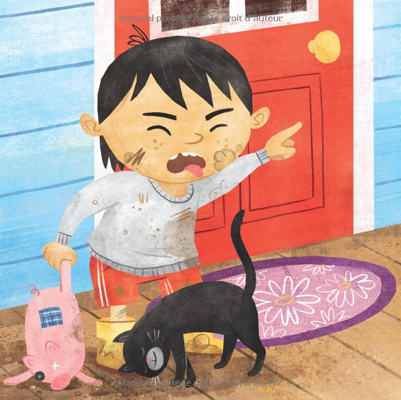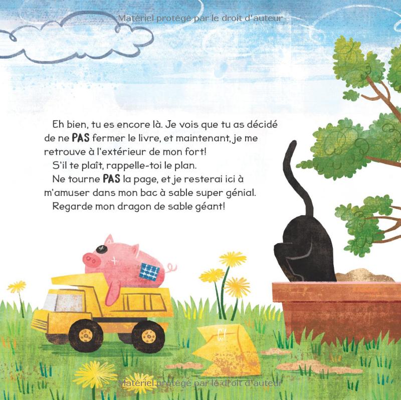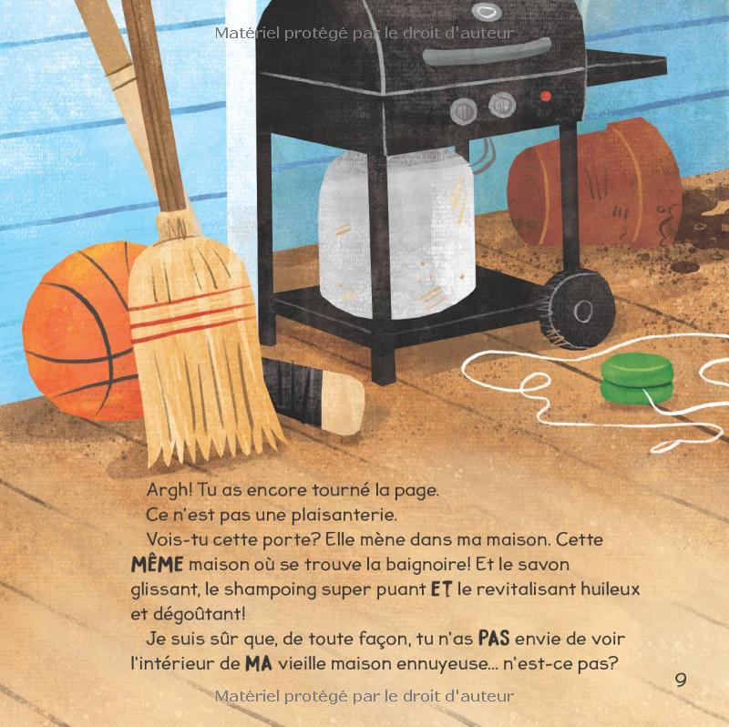 Dans cette histoire hilarante, les lecteur·rices prennent le contrôle. Au fil des pages, notre héros, Charlie, passe de sa cour boueuse a sa maison et se rapproche de la baignoire… en protestant à chaque étape