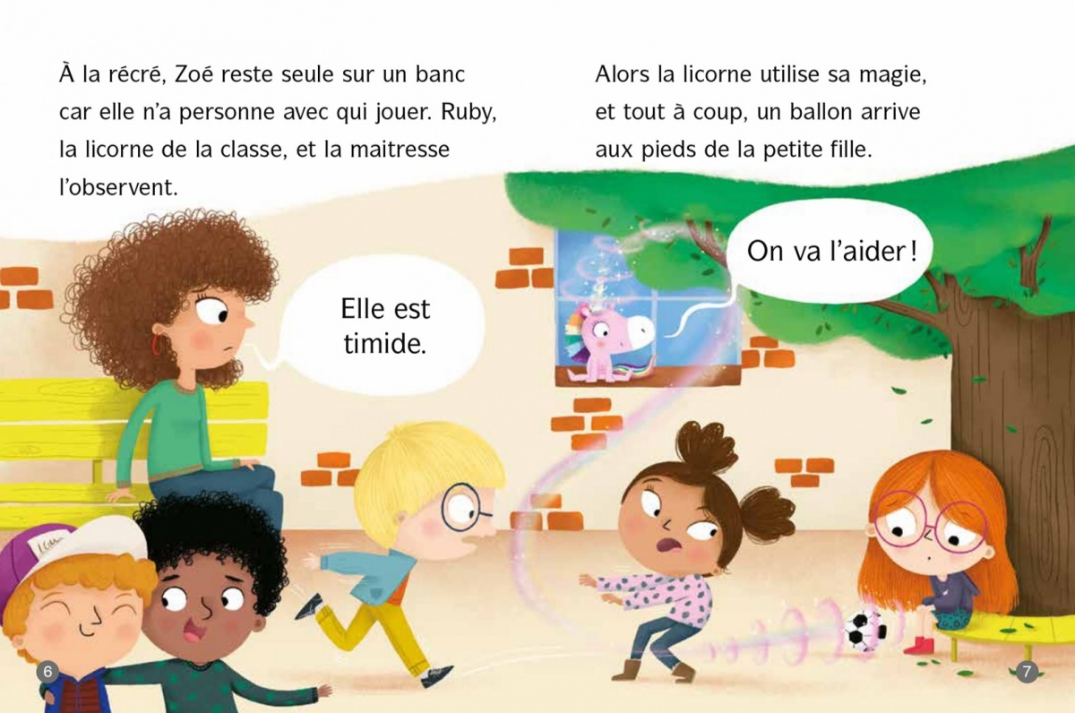 C’est la rentrée pour Zoé ! Difficile de se faire des amis quand on est nouvelle. Lina, la star de la classe, n’est pas sympa avec elle. Heureusement, Ruby la licorne utilise ses pouvoirs pour aider Zoé. Un coup de corne magique, et hop ! Elle entre dans ses rêves la nuit et lui donne confiance. Peut-être que Lina n’est pas si méchante… Le matin, Zoé trouve une pierre précieuse sous son oreiller. Waouh ! Plus rien ne peut lui arriver !