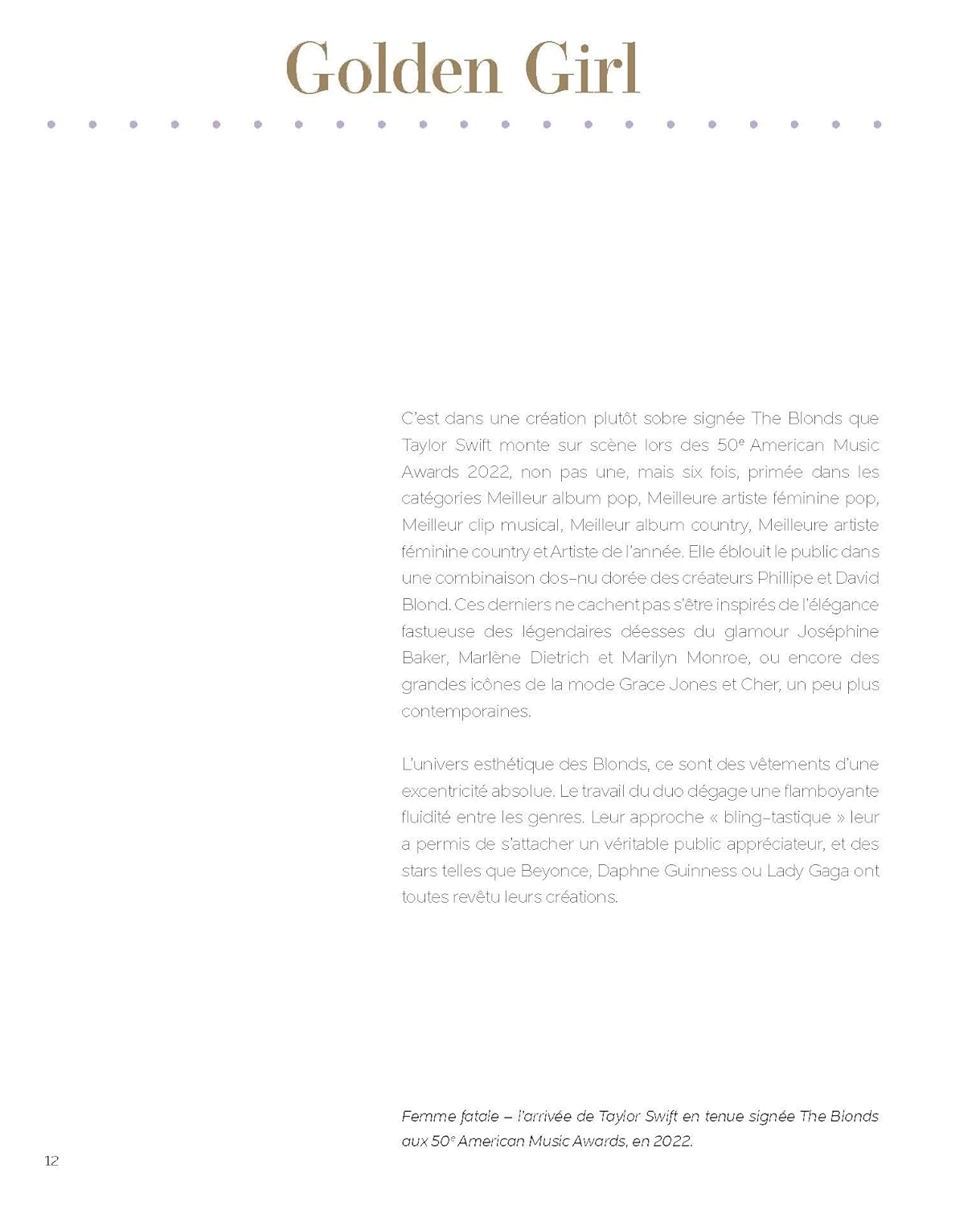 Taylor Swift . Ses tenues iconiques . Icône d’une génération, indépendante et créative, Taylor Swift domine la scène pop avec un charisme infini tout en gérant avec vigilance sa présence sur les réseaux. Phénomène mondial, elle entretient en même temps un lien de proximité avec ses fans. Sa garde-robe marque tout autant que ses chansons les différentes phases de sa vie trépidante. Taylor ne cherche pas à lancer de nouvelles tendances ; elle ne suit pas les modes. Tout ce qu’elle porte contribue à l’histoire qu’elle a à raconter, et suit la progression de son style musical ainsi que de son identité en tant que personne..